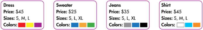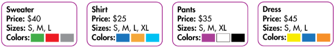 b. Swap roles and repeat. You’re a sales assistant at a store. You have the clothes below.