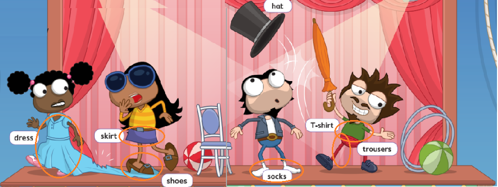 Actor 1: Thank you! Thank you! Look at my clothes. Do you like my green T-shirt and my red trousers?