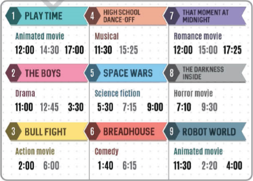 b. Now, listen and fill in the table with the movie times.