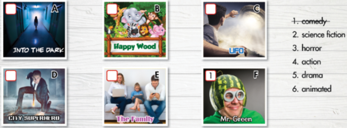 1. comedy 2. science fiction 3. horror 4. action 5. drama 6. animated |