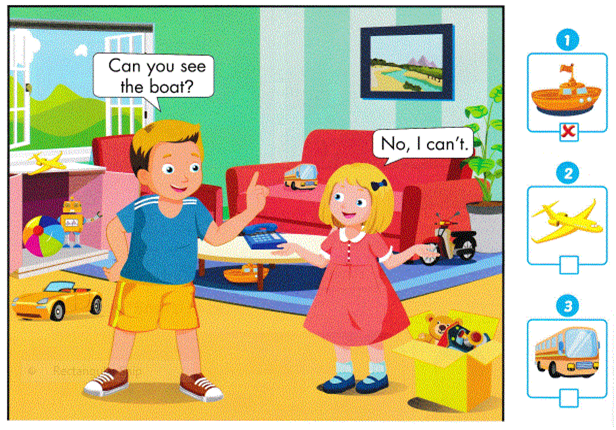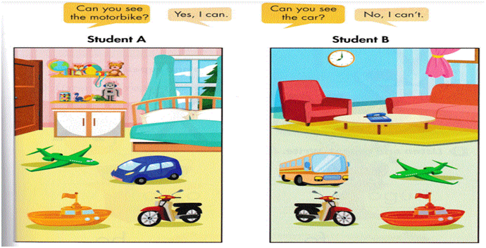 Cách chơi: Một bạn sẽ hỏi và 1 bạn sẽ nhìn lên bức tranh trên bảng để trả lời, ví dụ người hỏi “ Can you see the plane?”(Bạn có nhìn thấy chiếc máy bay không?).Mỗi bạn chơi sẽ trả lời “No, I can’t.” (nếu không phải) hoặc “Yes, I can.” (nếu phải).\