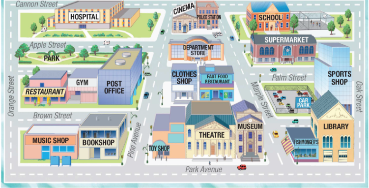 1. Look at the map. Listen and repeat. 2. Tell your partner which places are/ aren’t there near your house. 3. Use the phrases in the box and the map to give directions from: 4. Look at the pictures below. In which of the places in Exercise 1 can you see them? What do they mean?