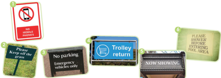 4. Look at the pictures below. In which of the places in Exercise 1 can you see them? What do they mean?