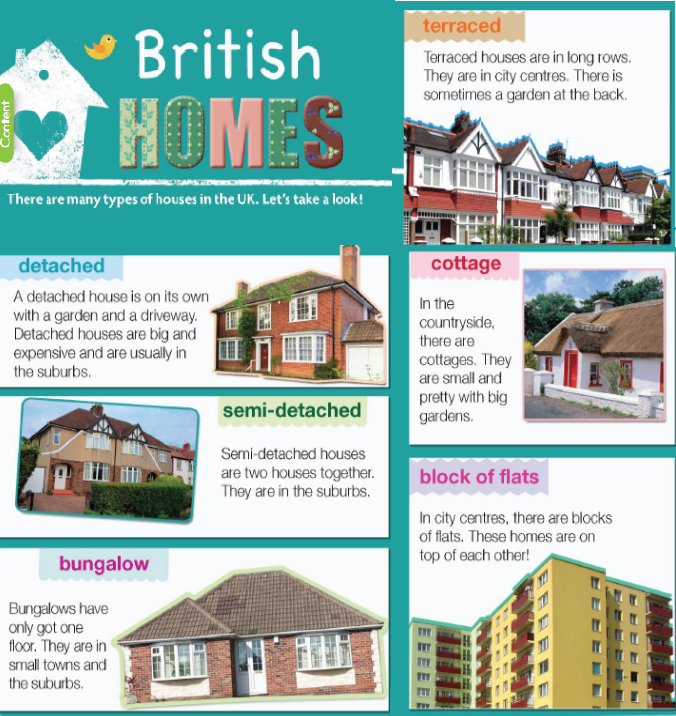 Cottages are small. They’re usually in the countryside. They’ve got big gardens. They aren’t very expensive.