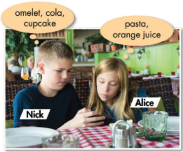 New Words a. Match the words with the pictures. Listen and repeat. b. Ask and answer. Reading a. Ben and Jane are at a new restaurant. Do they enjoy their meal? Yes/ No b. Now, tick the things they ordered on the menu. Grammar a. Listen and repeat. b. Fill in the blanks. Use a, an, some, or any. c. Look at Alice and Nick and complete the dialogue. d. Now, practice the conversation with your partner.