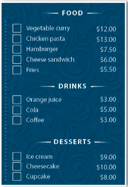 (Giờ thì, đánh dấu những món họ đã gọi trên thực đơn.)