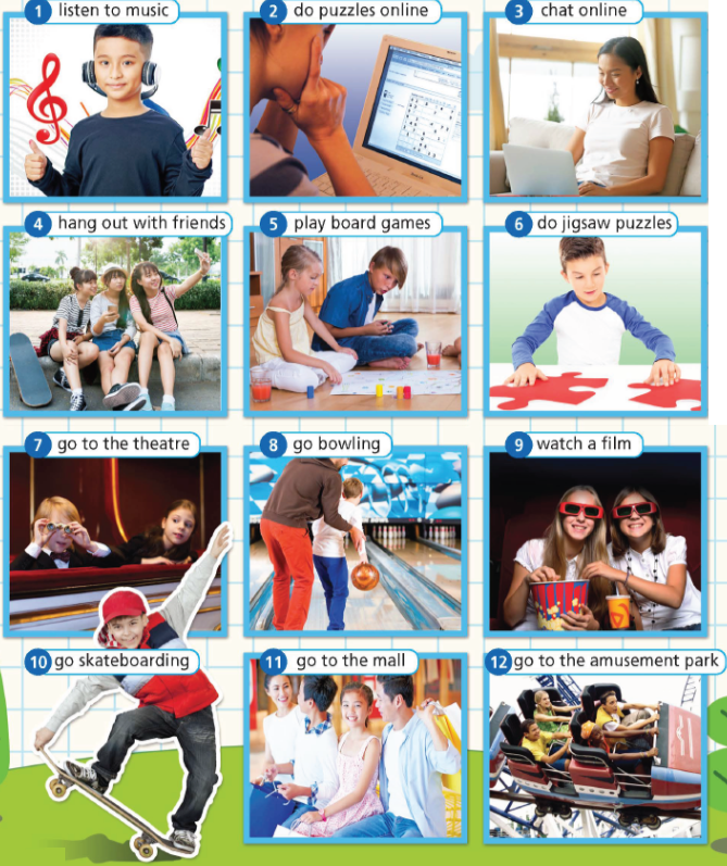 Free-time activities 1. Listen and repeat. 2. Which of the activities in Exercise 1 do you like/love/not like/hate doing in your free time? Tell your partner. You can use your own ideas as well.