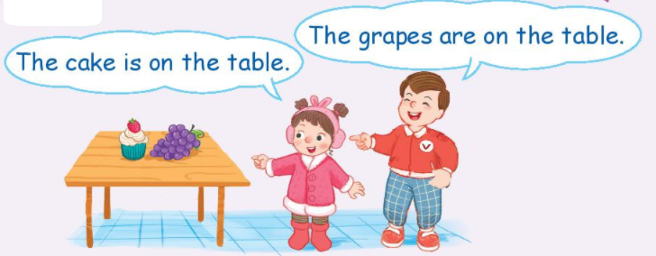 The cake is on the table. (Cái bánh ở trên bàn.)