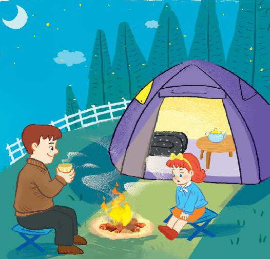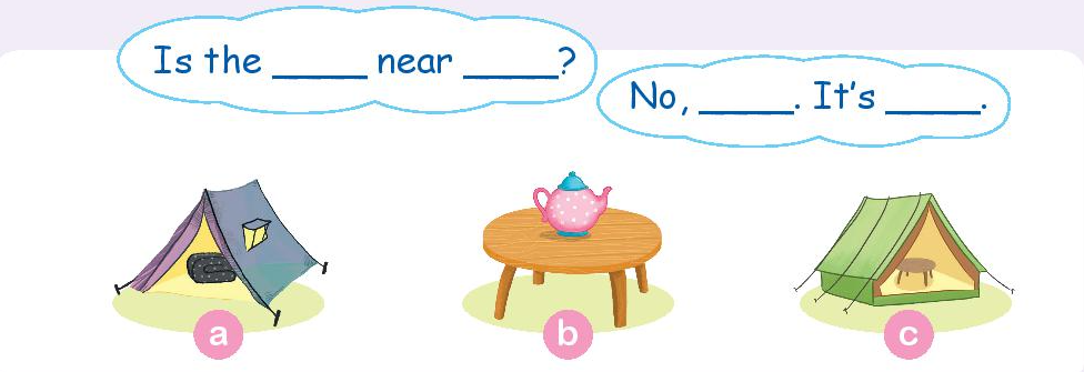 B: No, it isn’t. It’s in the tent. (Không, không gần. Nó ở trong lều.)