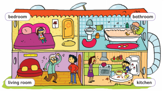 Học sinh cùng hỏi và trả lời về vị trí của từng người ở trong nhà.