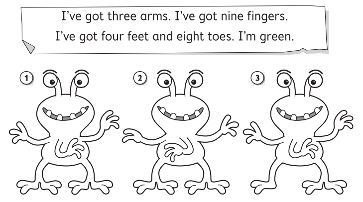 I’ve got three arms. I’ve got nine fingers. I’ve got four feet and eight toes. I’m green.