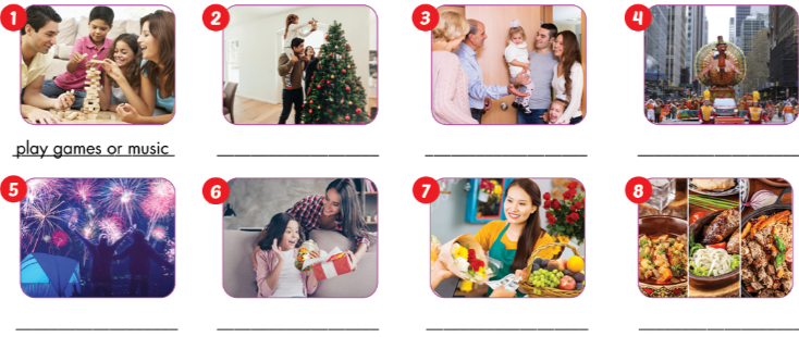 (Lễ tạ ơn: Mọi người ăn thức ăn đặc biệt, như gà tây và khoai tây nghiền, và xem các cuộc diễu hành lớn trên đường phố.)