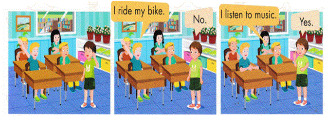 Cách chơi: Một bạn sẽ diễn tả 1 hành đông. Các bạn sẽ đoán bạn đó đang làm gì, ví dụ “I ride my bike.” (Tôi đi xe đạp.),hoặcI listen to music.” (Tôi nghe nhạc.). Nếu đúng thì nói “Yes”, sai thì nói “No”.