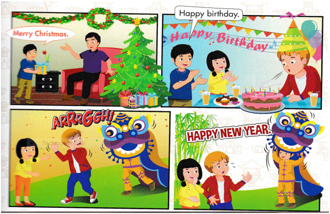Cách chơi: Các bạn sẽ đóng vai và thực hành với nhau, ví dụ 1 bạn nói “Happy birthday” hoặc “ Happy New Year”, hoặc “ Merry Christmas”, bạn còn lại sẽ nói cám ơn “Thank you”.