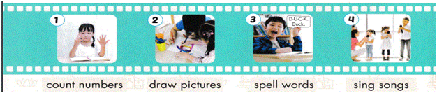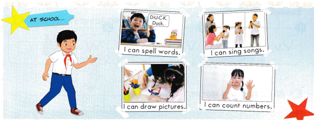 Cách chơi: Một bạn sẽ dùng hành đông để diễn tả. Các bạn khác sẽ đoán và dùng mẫu câu “I can…”, ví dụ “I can spell words.” (Tôi có thể đánh vần từ.), hoặc “I can count numbers” (Tôi có thể đếm số.). Nếu người chơi đoán đúng thì người diễn tả nói “Yes”, nếu sai thì nói “No”.