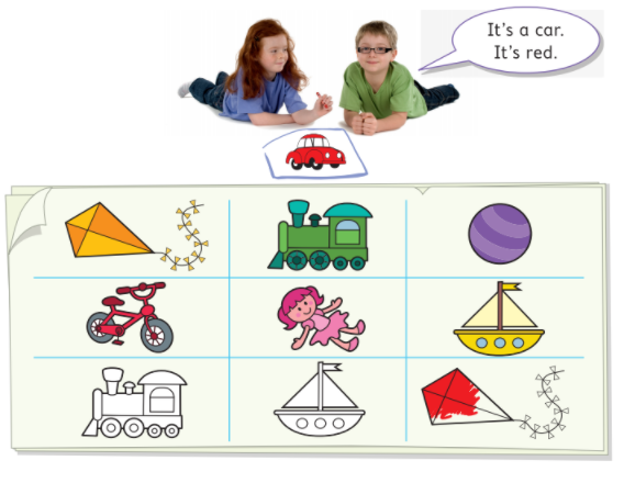 Gợi ý: Học sinh nói và tô màu đồ chơi theo sở thích của cá nhân. Sau đó, dùng bảng này để chơi Bingo cũng bạn bè trong lớp.