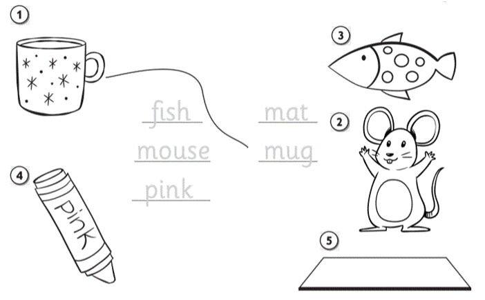 m=blue (từ có chứa m thì tô màu xanh dương: mat, mouse, mug)
