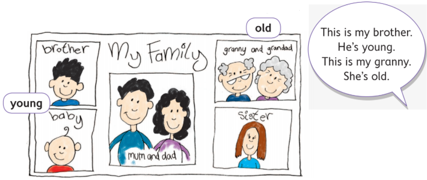 This is my brother. He’s young. This is my granny. She’s old.