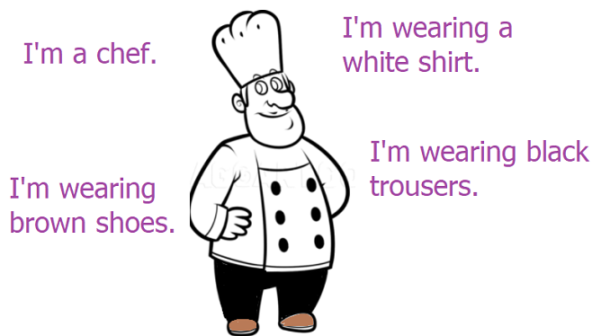 I’m a chef. I’s wearing a white shirt. I’m wearing black trousers. I’m wearing brown shoes.