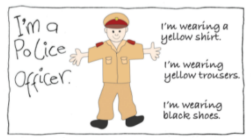 I’m a police officer. I’m wearing a yellow shirt. I’m wearing yellow trousers. I’m wearing black shoes.
