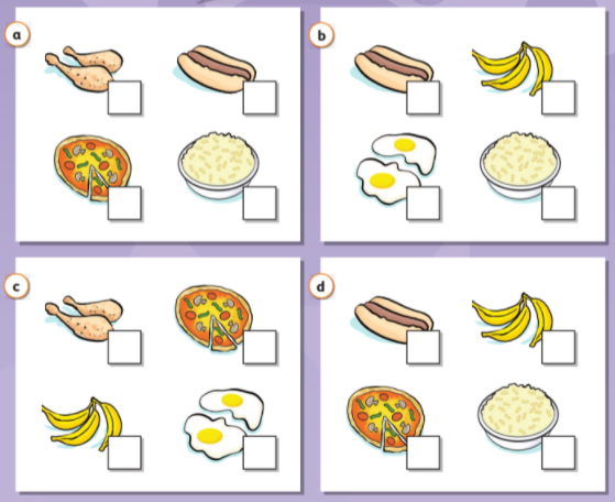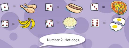 2. Mỗi học sinh chọn một trong các thẻ bữa ăn từ sách. Các học sinh thay phiên nhau ném súc sắc và cố gắng thu thập các thẻ thức ăn. Khi thu thập tấm thẻ nào, họ nói từ tương ứng và đánh dấu vào ô bên cạnh.
