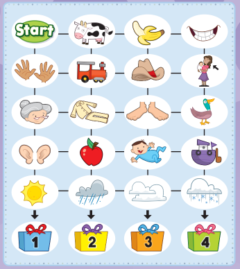 Học sinh lắng nghe và làm theo mẫu. Học sinh dùng bút chỉ vào từng bức tranh và di chuyển theo hiệu lệnh sang trái, phải, lên hoặc xuống. Khi họ nghe thấy DỪNG LẠI, họs sinh chỉ vào bức tranh có số tương ứng ở phía dưới, ví dụ: nếu dừng lại ở từ “sun”, đó là số 1.