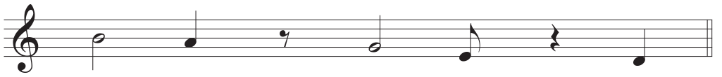 Gồm có: nốt Si – nốt trắng, nốt La – nốt đen, dấu lặng đơn, nốt Sol – nốt trắng, nốt Mi – nốt đơn, dấu lặng đen và nốt Rê – nốt đen.