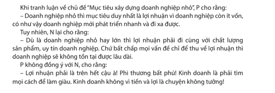 - Em đồng tình với quan điểm của N khi cho rằng doanh nghiệp nhỏ hay lớn thì lợi nhuận phải đi cùng với chất lượng sản phẩm, uy tín doanh nghiệp. Bởi một doanh nghiệp muốn tồn tại được thì phải có lợi nhuận, nhưng để lợi nhuận được lâu dài thì phải đi đối với chất lượng của sản phẩm và uy tín của doanh nghiệp. Nếu như chỉ nhìn vào cái lợi nhuận trước mắt thì doanh nghiệp đó rất dễ đánh mất mình, dần dần đánh mất lòng tin của khách hàng và có nguy cơ phá sản.