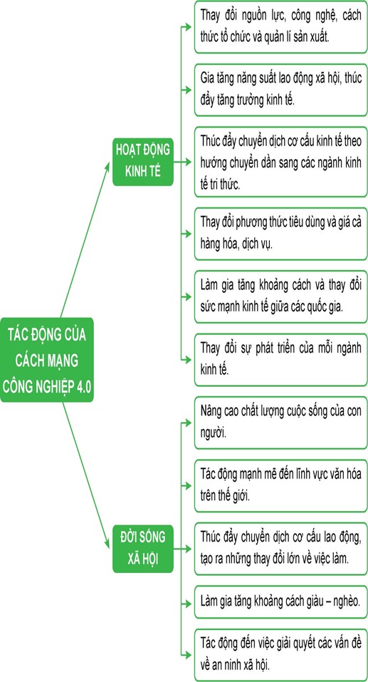 Vẽ sơ đồ thể hiện tác động chủ yếu của cuộc cách mạng công nghiệp 4.0 đến kinh tế xã hội trên thế giới.