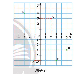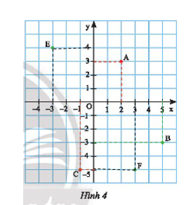 Từ điểm \(F\) ta vẽ vuông góc với \(Ox;Oy\) cắt \(Ox\) tại 3 và cắt \(Oy\) tại – 5 nên \(E\left( {3; - 5} \right)\).
