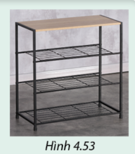 Hình 4.53 là kệ khung sắt, xem các thanh sắt xung quanh là hình ảnh của những đường thẳng và bề mặt tầng trên cùng của kệ (bằng gỗ) là một phần của mặt phẳng (P). Để trang trí kệ sách này, Nam tô màu đỏ những đường thẳng có điểm chung với (P), tô màu xanh những đường thẳng không có điểm chung với (P) để gửi cho thợ sơn. Hãy chỉ ra những thanh sắt nào cần tô màu đỏ, những thanh sắt nào cần tô màu xanh.