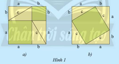 - Đặt bốn tam giác vuông còn lại lên hình vuông thứ hai như trong Hình 1b. Phần bìa không bị che lấp là hình vuông có cạnh là \(c\). Tính diện tích phần bìa đó theo \(c\).