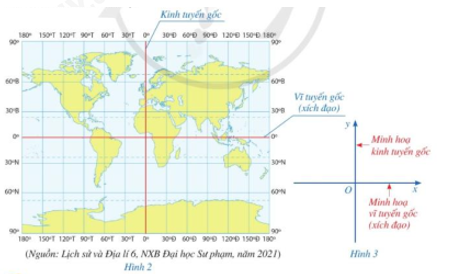 Hình 2 là một dạng phép chiếu bản đồ có các đường kinh tuyến và vĩ tuyến đều là các đường thẳng, trong đó kinh tuyến gốc và vĩ tuyến gốc được minh họa bằng hai đường thẳng nào đó. Chúng được biểu diễn bởi hai trục Ox, Oy trên mặt phẳng ở hình 3. Nêu nhận xét về hai trục Ox, Oy.