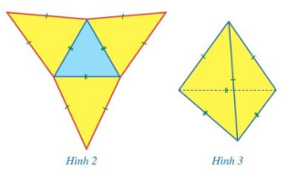 b) Cắt rời theo đường viền (màu đỏ), của hình vừa vẽ (phần tô màu) và gấp lại để được hình chóp tam giác đều như ở Hình 3.