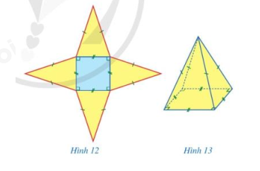 b) Cắt rời theo đường viền (màu đỏ) của hình vừa vẽ (phần tô màu) và gấp lại để được hình chóp tứ giác đều như hình 13.