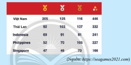 Bạn Tú đã tìm hiểu về năm quốc gia có số huy chương vàng cao nhất ở SEA Games 31 từ bảng thống kê sau: