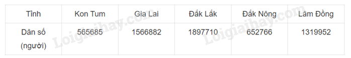 Sử dụng phương pháp thích hợp để thu thập dữ liệu và lập bảng thống kê dân số các tỉnh Tây Nguyên: Kon Tum, Gia Lai, Đắk Lắk, Đắk Nông, Lâm Đồng.