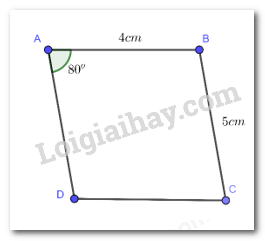 Cho hình bình hành ABCD có \(\widehat A = {80^o};AB = 4cm;BC = 5cm\). Tính số đo mỗi góc và độ dài các cạnh còn lại của hình bình hành ABCD.