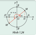 a) Dựa vào Hình 1.24, hãy so sánh \(\sin \left( {\alpha + \pi } \right)\) và \(\sin \left( \alpha \right)\); \({\rm{cos}}\left( {\alpha + \pi } \right)\) và \(\cos \left( \alpha \right)\).