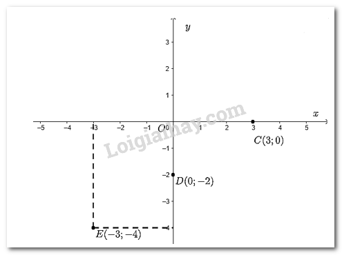 Vẽ một hệ trục tọa độ \(Oxy\) và đánh dấu các điểm \(C\left( {3;0} \right);D\left( {0; - 2} \right);E\left( { - 3; - 4} \right)\)