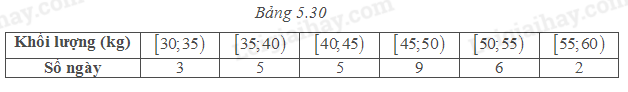 Bảng 5.30 do người quản lí một cửa hàng thực phẩm lập được sau khi thống kê lượng hoa quả (đơn vị: kg) bán ra hàng ngày trong một tháng.