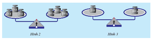 c) Tiếp theo, chia các quả cân trên mỗi cân thành ba phần bằng nhau, rồi bỏ ra hai phần (hình 3). Khi đó, cân còn thằng bằng không? Tại sao?