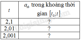 b) Cho biết gia tốc trung bình (đơn vị \(m/{s^2}\)) của vật trong khoảng thời gian \(\left[ {{t_0};t} \right]\) được tính bởi công thức \({a_{tb}} = \frac{{v\left( t \right) - v\left( {{t_0}} \right)}}{{t - {t_0}}}\). Hãy tính gia tốc trung bình trong các khoảng thời gian \(\left[ {{t_0};t} \right]\) với \({t_0} = 2\) và \(t\) lần lượt là \(2,1\); \(2,01\); \(2,001\). Sau đó, hoàn thành Bảng 7.3.
