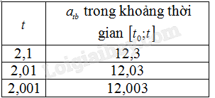 +) Với \(t = 2,01\) ta có \({a_{tb}} = 3.\left( {2,01 + 2} \right) = 12,03\)