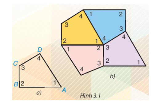 Cắt bốn tứ giác như nhau bằng giấy rồi đánh số bốn góc của mỗi tứ giác như tứ giác ABCD trong Hình 3.1a. Ghép bốn tứ giác giấy đó để được hình như Hình 3.1b.