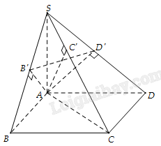 Cho hình chóp \(S.ABCD\) có đáy là hình chữ nhật và \(SA\) vuông góc với đáy. Gọi \(B',C',D'\) lần lượt là hình chiếu của \(A\) trên các cạnh \(SB,SC,SD\). Chứng minh \(SC \bot \left( {AB'D'} \right)\) và \(AB',AC',AD'\) cùng nằm trên một mặt phẳng.