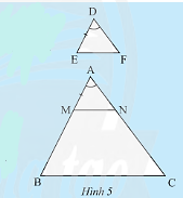 Cho tam giác \(DEF\) và tam giác \(ABC\) có \(DE = \frac{1}{3}AB,DF = \frac{1}{3}AC,\widehat D = \widehat A\) (Hình 5). Trên tia \(AB\), lấy điểm \(M\) sao cho \(AM = DE\). Qua \(M\) kẻ \(MN//BC\left( {N \in AC} \right)\).