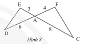 Cho tam giác \(ADE\) và tam giác \(ACF\) có các kích thước như trong Hình 8. Chứng minh rằng \(\Delta ADE\backsim\Delta ACF\).
