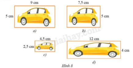 \(\frac{9}{{4,5}} = 2;\frac{5}{{2,5}} = 2\). Do đó, tồn tại hình động dạng phối cảnh của hình 8a bằng hình 8c (hình 8a thu nhỏ với tỉ số 2). Do đó, hình 8a và hình 8c đồng dạng với nhau.