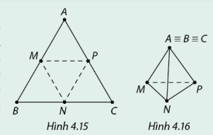 a) Hãy sử dụng một giấy bìa cứng, vẽ và cắt thành hình một tam giác đều ABC như Hình 4.15. Lấy các điểm M, N, P lần lượt là trung điểm của AB, BC, CA, sau đó gấp lại theo các đường nét đứt MN, NP, PM và dán các mép với nhau bằng băng dính để được mô hình có hình biểu diễn như Hình 4.16.